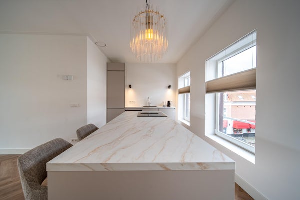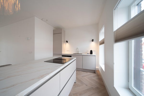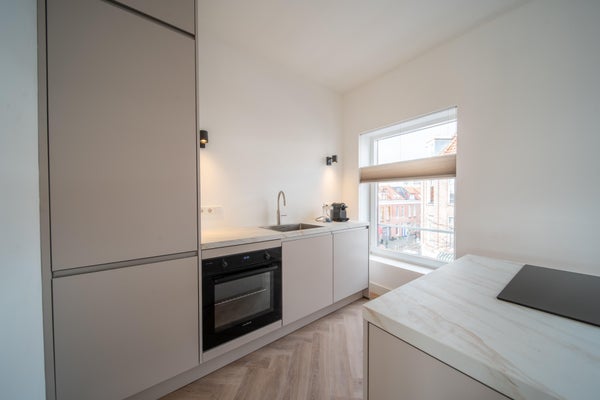 Eerste verdieping: Via de centrale deur op de begane grond bereikt u met de trap de tweede verdieping en ook direct dit prachtige appartement. Bij binnenkomst wordt u verwelkomt in de entreehal met toegang tot alle vertrekken; een lichte slaapkamer aan de achterzijde, en een ruime en lichte woonkamer met open keuken aan de voorzijde. De luxe keuken is een droom voor elke kookliefhebber: voorzien van een imposant natuurstenen aanrechtblad van ruim 2,5 meter, een handige Quooker (heetwaterkraan), en alle moderne inbouwapparatuur. De inductiekookplaat met ingebouwde afzuiging, aparte vrieskast, koelkast, vaatwasser en combi-oven maken deze keuken compleet en functioneel.