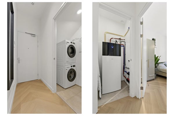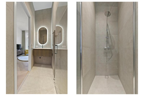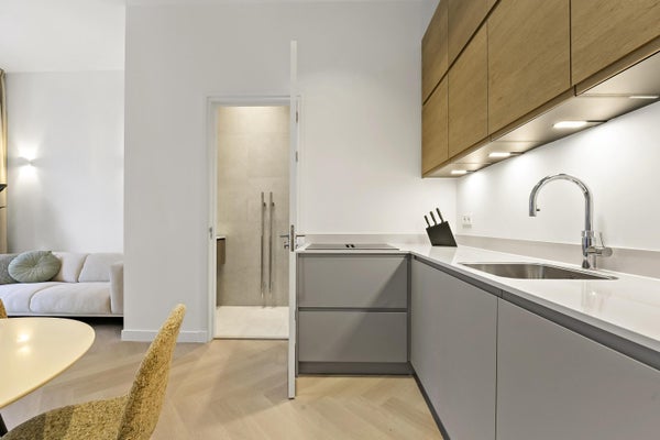 Entree op straat niveau, algemene voordeur. Hal met toegang tot de voordeur van het appartement. Hal met toegang tot alle vertrekken. Vanuit de hal toegang tot een handige kast, het nieuwe toilet en aparte kast met bergruimte. Entree naar de woonkamer. Wat direct opvalt is hoe licht dit appartement is dankzij de openslaande deuren naar de ruimte tuin op het zuidoosten, de stijlvolle meubilering en de open keuken met composieten werkblad welke van alle gemakken is voorzien. Denk hierbij aan een luxe Quooker heetwaterkraan, een oven-magnetron combinatie van Siemens, een koelkast, vaatwasser en een inductiekookplaat met downdraft. De woning is verder voorzien van een visgraat PVC vloer en wordt verwarmd (en gekoeld!) middels een warmtepomp. Vanuit de woonkamer bereik je de badkamer welke is voorzien van een aparte inloopdouche, een wastafelmeubel en een verwarmde spiegel met verlichting.