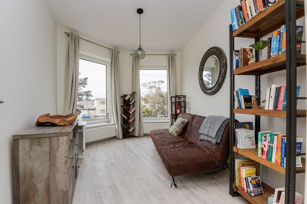 Vanuit de hal heb je toegang tot de eerste slaapkamer, die perfect als kantoor kan worden gebruikt.