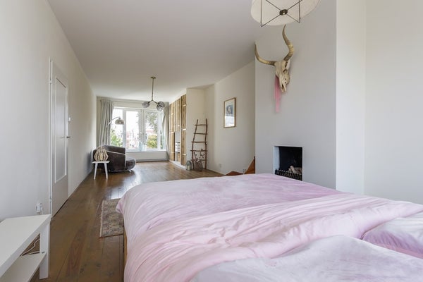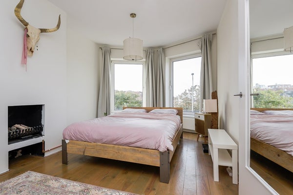 Bij het teruggaan naar de overloop neem je de trap naar de tweede verdieping. Bovenaan de trap heeft de overloop een ingebouwde kast met een wasmachine-droger. Aan de voorkant van het appartement is er een slaapkamer met een erker, en aan de achterkant vind je een andere slaapkamer, die momenteel als inloopkast wordt gebruikt. Tussen deze twee kamers in biedt de badkamer een inloopdouche, een wastafel en een toilet. De grote master bedroom strekt zich over de volle lengte van het appartement. Het heeft weer een gashaard en een erker aan de voorkant, wat een elegante en uitnodigende ruimte creëert.