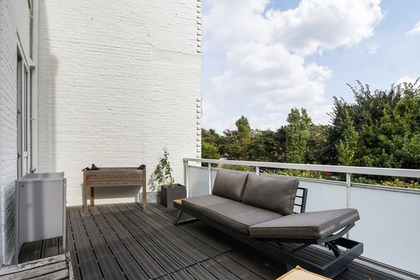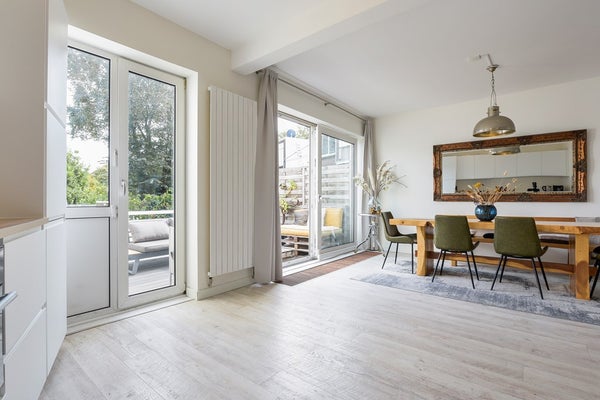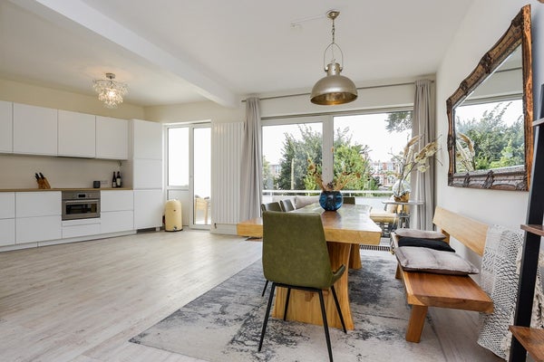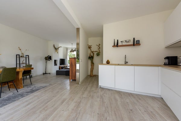 Bij het bereiken van de eerste verdieping stap je op de overloop. Aan je linkerhand bevindt zich een gastenbadkamer met een inloopdouche, een toilet en een wastafel. Verder naar voren kom je in de lichte, open woonkamer. Aan de voorkant is een charmante gashaard, en een erker brengt veel daglicht binnen. Loop je naar achteren, dan leiden schuifdeuren naar een ruim balkon. De moderne open keuken is volledig uitgerust met een inductiekookplaat, afzuigkap, oven, vaatwasser en koelkast-vrieskast.