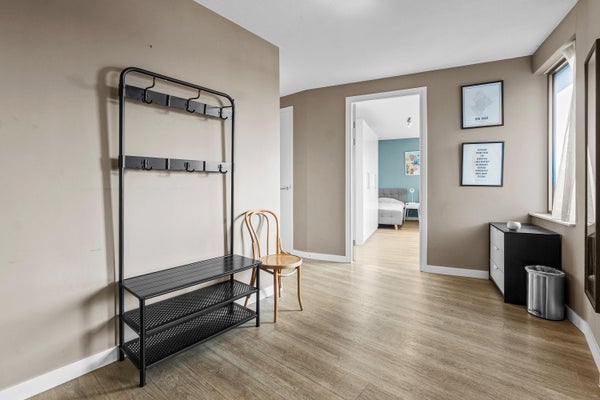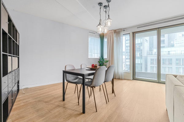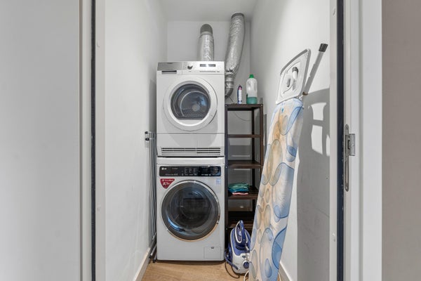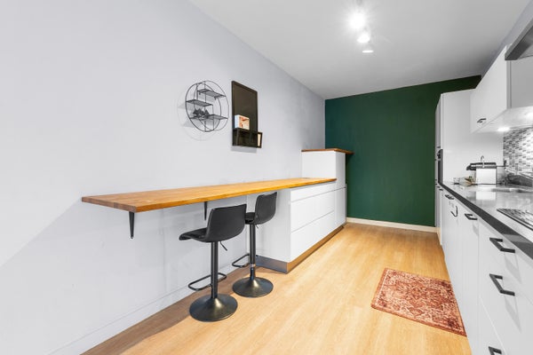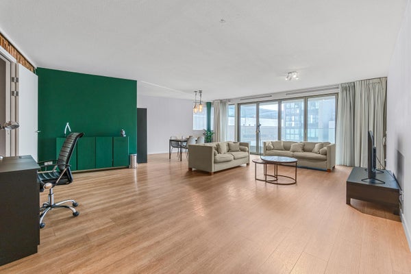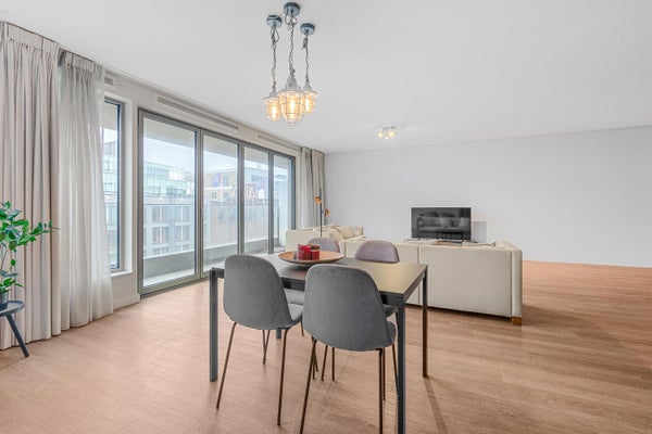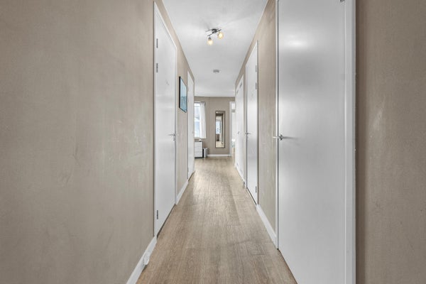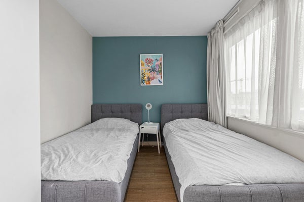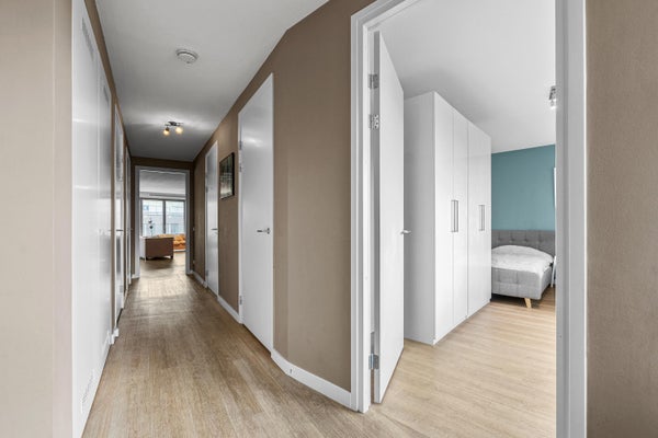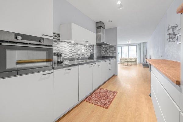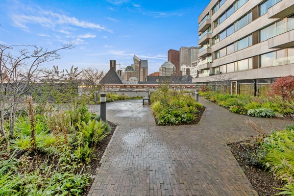 De royale woonkamer heeft grote raampartijen met veel natuurlijk licht en een schuifpui naar het zonnige balkon. De halfopen keuken is voorzien van alle moderne inbouwapparatuur. Er zijn twee ruime slaapkamers met uitzicht op de gemeenschappelijke daktuin en het Buitenhof.