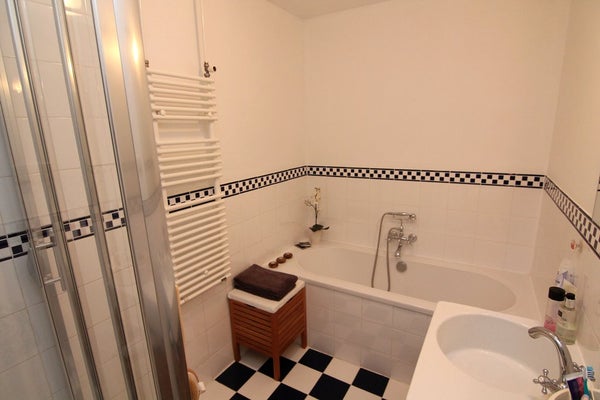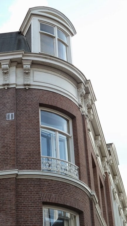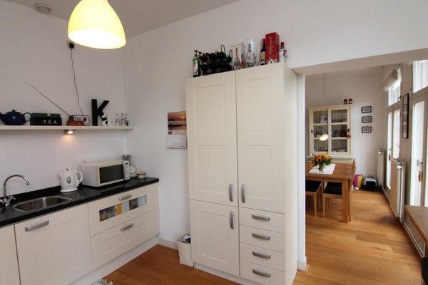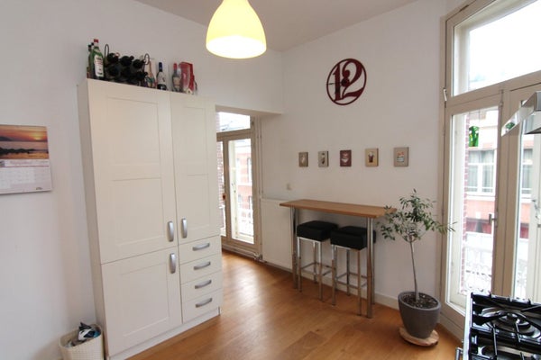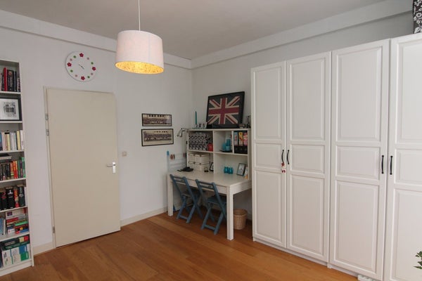 2e verdieping: ingang/hall, modern toilet met wastafel, diepe kast met centrale verwarmingsketel en wasmachine/voorraadkast, heerlijke lichte woon/eetkamer aan de voorkant (ca. 5.00x4.35) met uitzicht op het Vredespaleis, luxe, moderne semi-open keuken met apparatuur (d.w.z. 5-pits gasfornuis (Boretti), koelkast/vriescombinatie, vaatwasser, magnetron) en ontbijthoek, Franse balkon, ruime slaapkamer aan de achterkant (ca. 5.10x3.95), 2e slaapkamer aan de achterkant (ca. 4.00x4.30), toegang tot balkon (ca. 9.20x1.70) op het S/O gericht, moderne badkamer met bad, aparte douche, wastafel en handdoekradiator.