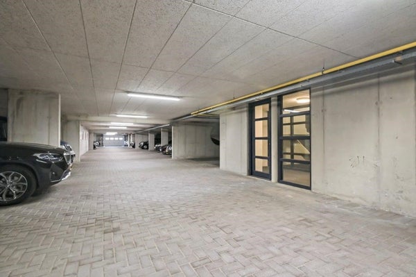 Privéparkeerplaats in de afgesloten garage, bereikbaar via lift en trap.