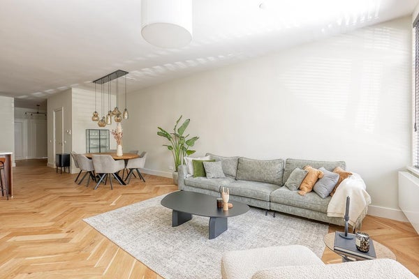 De riante woonkamer is gelegen aan de voorzijde van de woning, met zeer smaakvol ingerichte zit- en eethoek. Dankzij de grote raampartijen is de woonkamer voorzien van veel natuurlijke lichtinval.