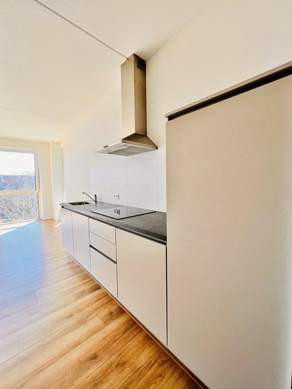 De keuken is voorzien van onder andere een koelkast, een inductie kookplaat en een vaatwasser.