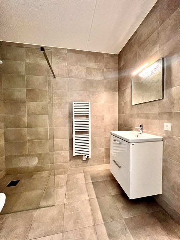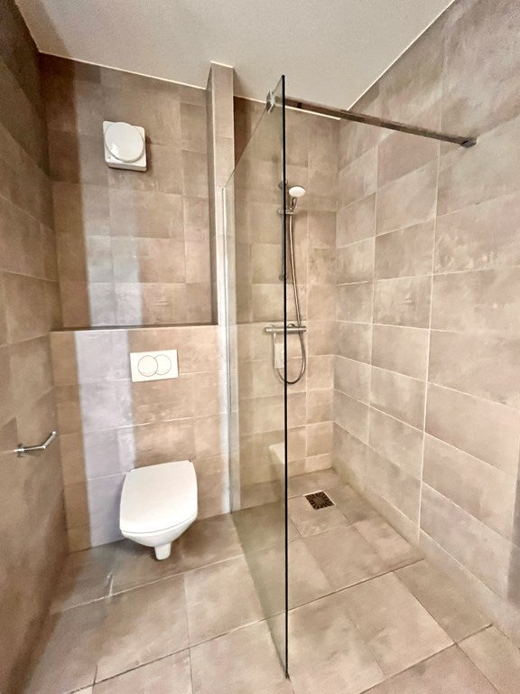 De volledig betegelde badkamer is voorzien van een inloopdouche, een toilet en een wastafelmeubel met spiegel.