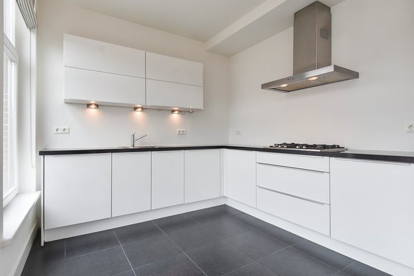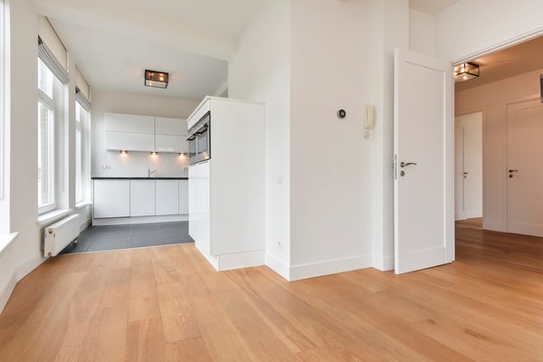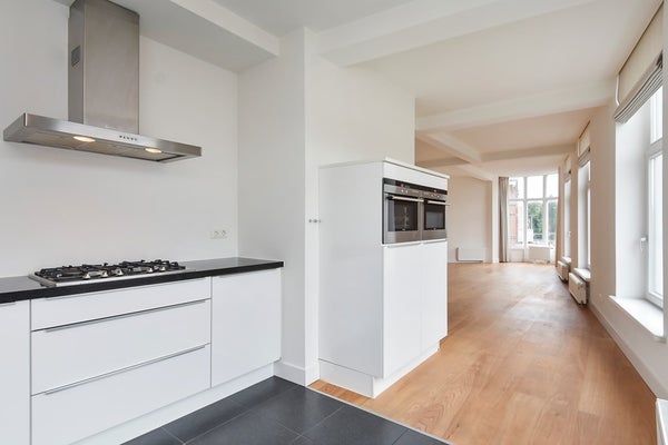 Riante woonkamer met houten vloer en zeer veel lichtinval door de grote raampartij aan de Groot Hertoginnelaan. Open keuken met inbouwapparatuur (koelkast, vaatwasser, oven, combimagnetron en 5-pits gasfornuis).