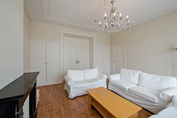 Kleine overloop. Huge zonnige woonkamer/eetkamer (66 m2) met originele scheidings schuifdeuren en inbouwkasten aan beide zijden. Voorste kamer (5.51 x 4.96m) en achterste kamer (7.45 x 4.90).