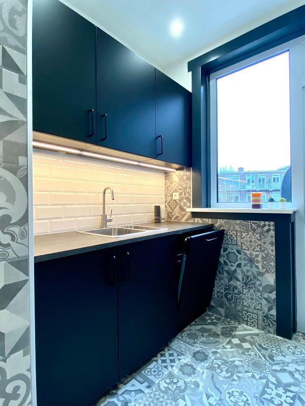 - De studio heeft een aparte keuken van uitstekende kwaliteit die volledig is uitgerust met een vaatwasser, koelkast/vriezer, inductiekoken, een combimagnetron, bestek, borden en ruime opbergruimte.