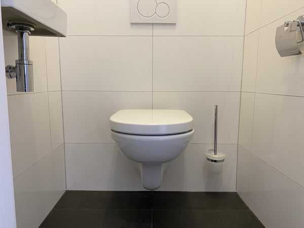 Voordeur van het appartement op de 1e verdieping na een open portiek. U komt binnen in de hal. Deze heeft een aparte WMA-ruimte, een apart zwevend toilet met fonteintje en bied verder toegang tot alle vertrekken van dit heerlijk, lichte appartement.