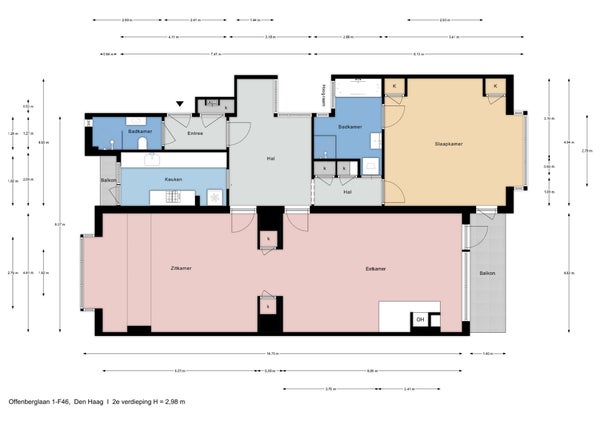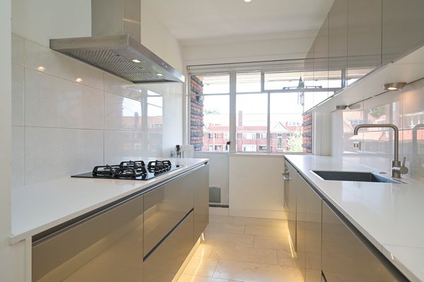 Het appartement beschikt over een ruime hal, een lichte woon-/eetkamer met een open haard en toegang tot een balkon. De moderne keuken is uitgerust met inbouwapparatuur en heeft een klein balkon met uitzicht. Daarnaast zijn er een badkamer met inloopdouche, een lichte slaapkamer met ingebouwde kasten, en een tweede badkamer met douche en ligbad. Met een woonoppervlak van 137 m², een actieve VvE en een eigen parkeerplek biedt dit appartement veel comfort.