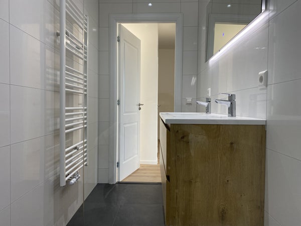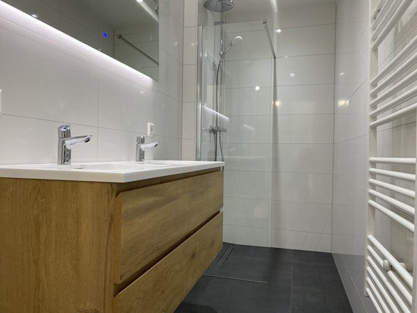 De volledig nieuw geplaatste en moderne badkamer is voorzien van een dubbele wastafel met lades, spiegel met licht, handdoekradiator en inloopdouche met regendouche.
