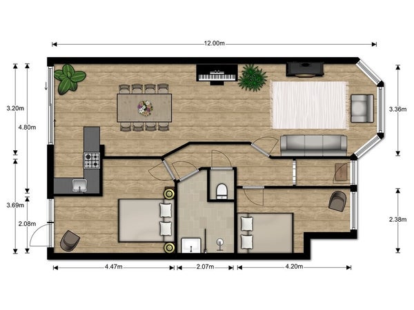 De hal leidt naar de ruime woonkamer, die ook een semi-open keuken, twee slaapkamers, een badkamer en een gastentoilet voor extra gemak heeft.