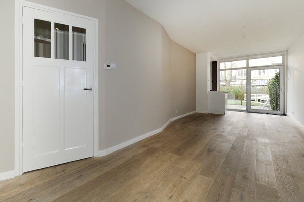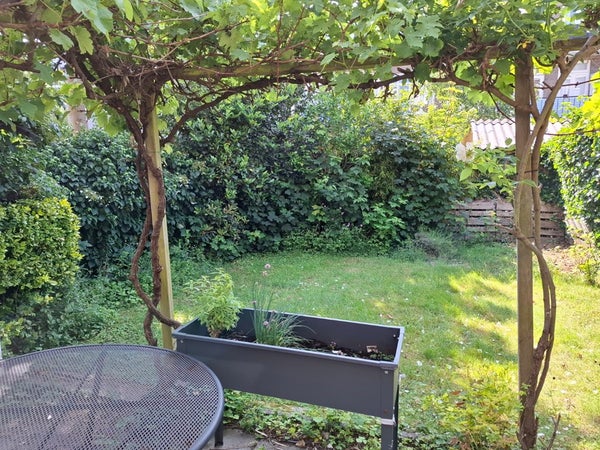 Deze kamer biedt toegang tot de grote, groene tuin via de brede schuifdeuren. De tuin is ruim en praktisch, met een betegeld terras dat perfect is voor buiten zitten en ontspanning. Voorbij het terras vind je een goed onderhouden gazon omringd door groen, wat zorgt voor een rustige en uitnodigende buitenruimte.