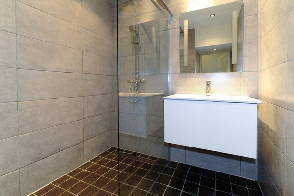 De stijlvolle badkamer beschikt over een inloopdouche en een moderne wastafel, wat zorgt voor een verfrissende en comfortabele ruimte.