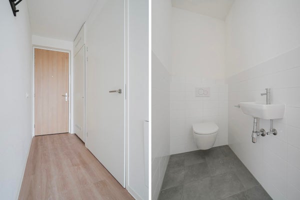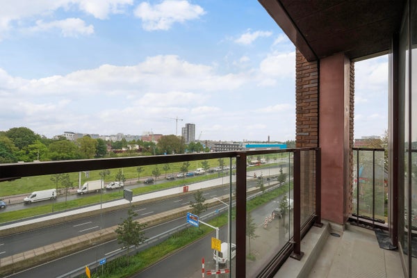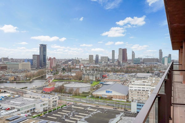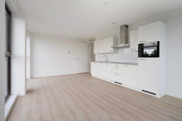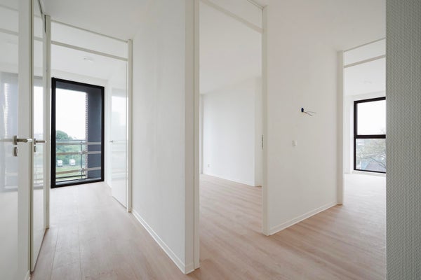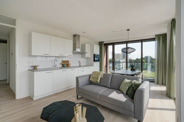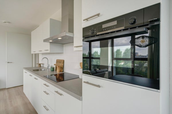 Je komt dit lichte tweekamerappartement binnen via de hal. Vanuit hier stap je de ruime woonkamer in met open keuken. De keuken is voorzien van alle moderne inbouwapparatuur. Dankzij de grote raampartijen van vloer tot plafond valt er veel daglicht naar binnen en geniet je van een ruimtelijk gevoel. Open de deur naar buiten en ervaar het prachtige uitzicht over de skyline van Den Haag vanaf je eigen buitenruimte.