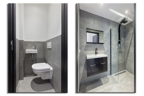 Toilet met wastafeltje. Badkamer voorzien van inloopdouche en vaste wastafel. Aparte ruimte voorzien van wasmachine en droger.