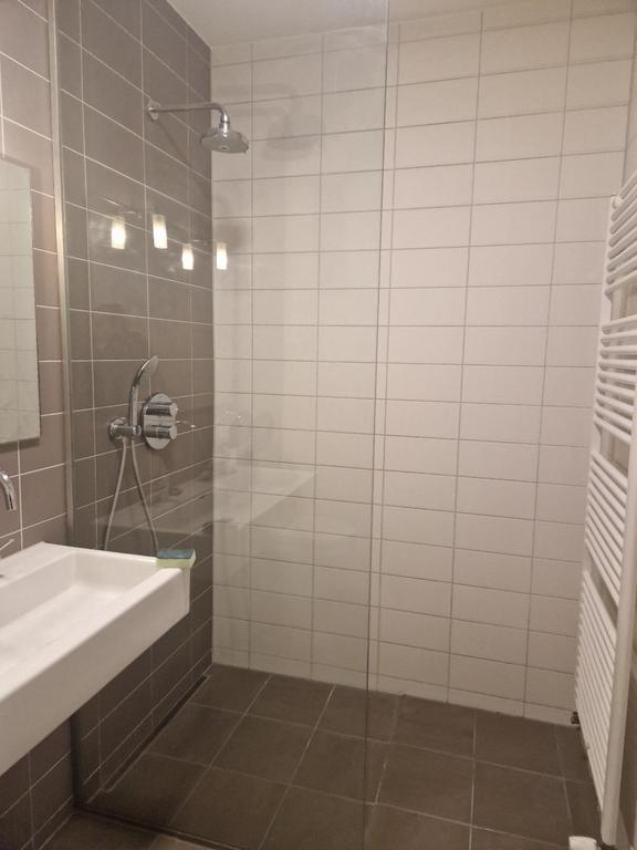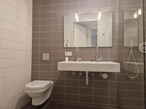 - badkamer met inloopdouche, toilet en dubbele wastafel