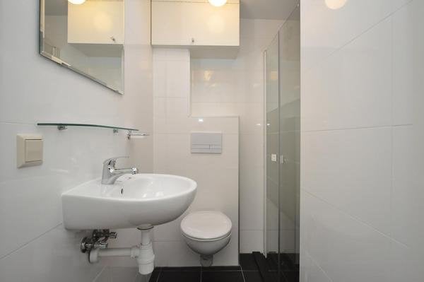 De woning beschikt verder over een slaapkamer. De badkamer is uitgevoerd met antracietgrijze plavuizen, grote witte wandtegels, een daklicht, inloopdouche, tweede zwevend wandcloset, wastafel met spiegel en mechanische ventilatie.