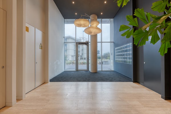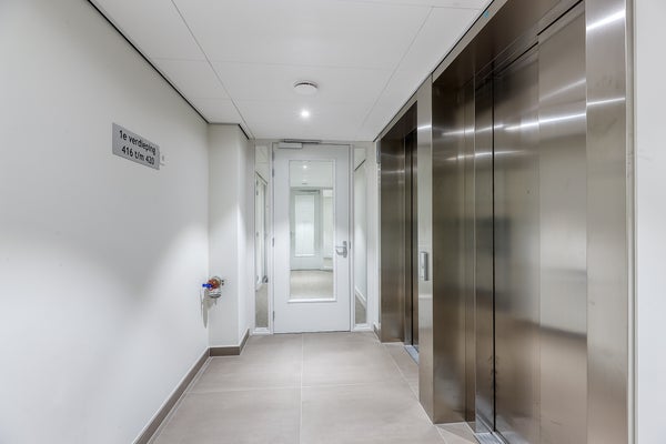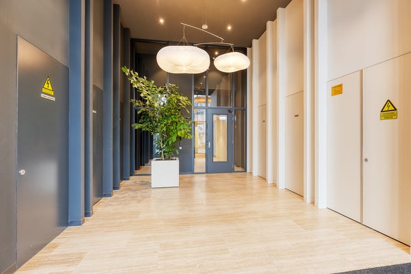 Gesloten entree op straatniveau met intercom en brievenbussen. Trap of lift naar de eerste verdieping.