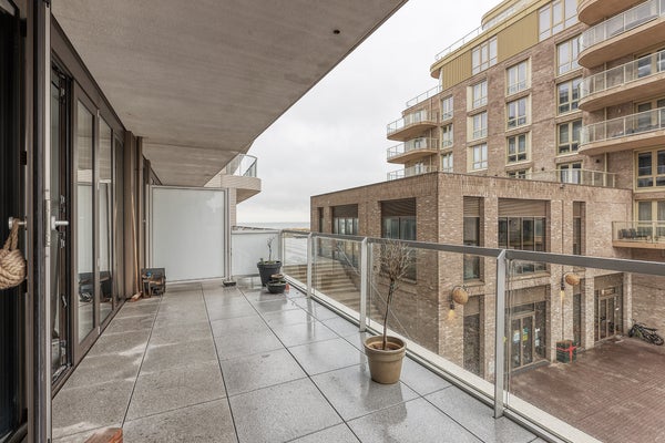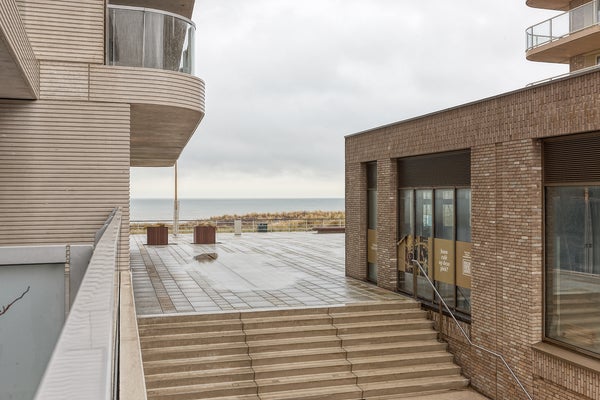De riante woonkamer is voorzien van grote raampartijen en biedt toegang tot het zeer ruime terras, gelegen op het noordoosten, met uitzicht op de promenade en zee, de ideale plek om gasten te entertainen of lekker te ontspannen. De open keuken is van alle gemakken voorzien en beschikt over een inductie kookplaat met afzuigkap, vaatwasser, combi-oven, koelkast en vriezer. Daarnaast is er voldoende bergruimte.