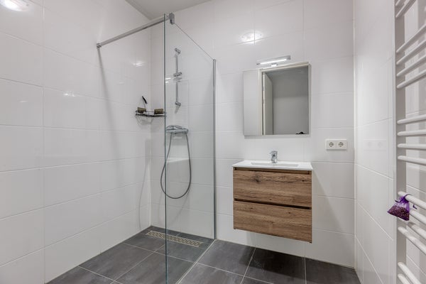 De ruime slaapkamer is erg licht en verschaft eveneens toegang tot het terras. De moderne badkamer is voorzien van een inloopdouche, wastafel met meubel en design radiator.