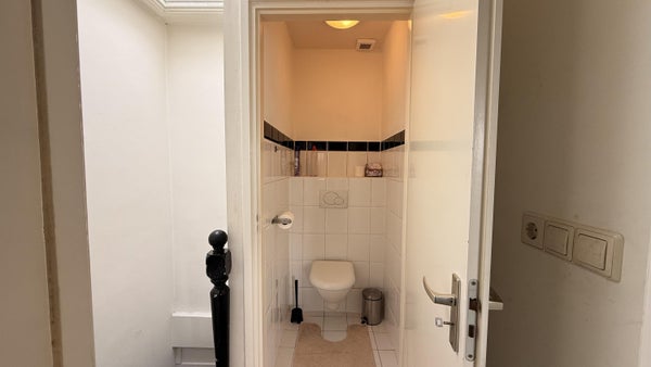 Entree op straatniveau, via het gemeenschappelijke trappenhuis bereikt u de tweede etage waar de voordeur van het appartement zich bevindt. De hal biedt tevens toegang tot een apart toilet, exclusief voor dit appartement.