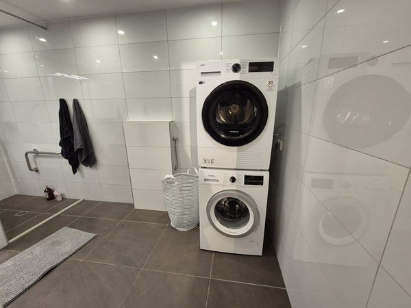 Badkamer met inloopdouche, wastafel, handdoekradiator en wasmachine/droger.
