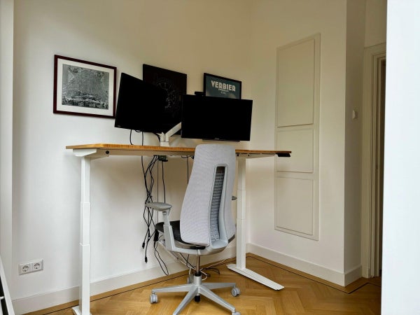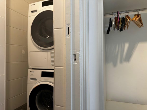 Tweede hal met inbouwkast en wasruimte met wasmachinie en droger. Twede slaapkamer in gebruik als werkkamer met in hoogte verstelbaar bureau en ook vanuit deze kamer toegang tot het balkon.