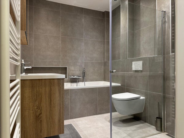 De luxe en ruime badkamer tot slot, is voorzien van een ligbad, inloopdouche, wastafel in meubel en vrijhangend toilet.