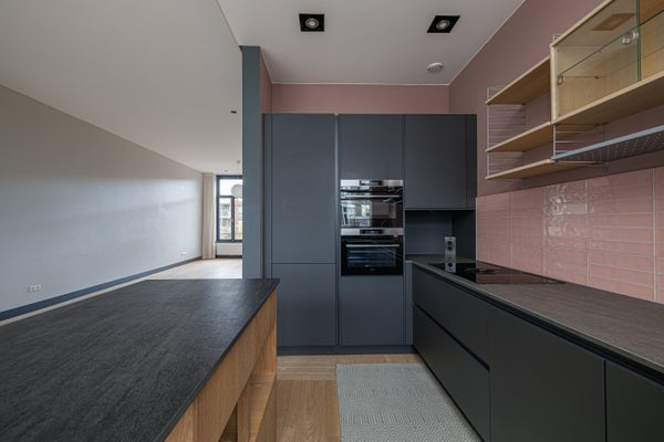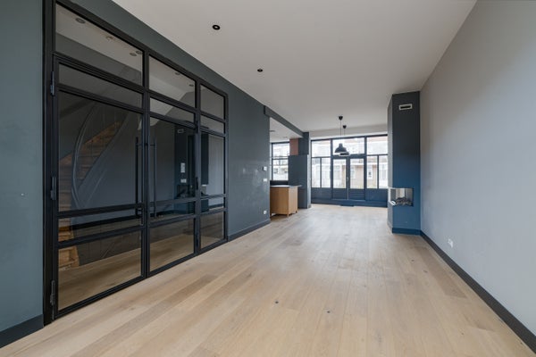 Overloop met toegang tot de woonkamer middels moderne stalen deuren, trap naar de tweede verdieping en separaat toilet met fonteintje. De woonkamer is circa 75m2 (inclusief keuken) en strekt zich uit over de gehele lengte van de woning. Design open keuken voorzien van koelkast, magnetron, oven, vaatwasser, inductiekookplaat en geïntegreerde afzuigkap. Er is een mooie gashaard. Aan de achterzijde van de woning is een groot terras (ca. 25m2) gelegen op het zonnige zuidwesten. Overal massief eiken vloeren.