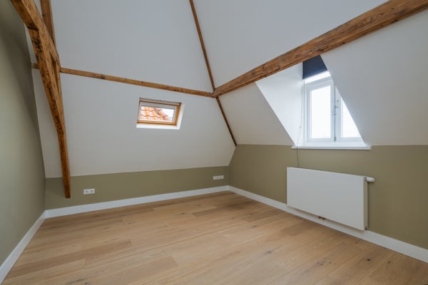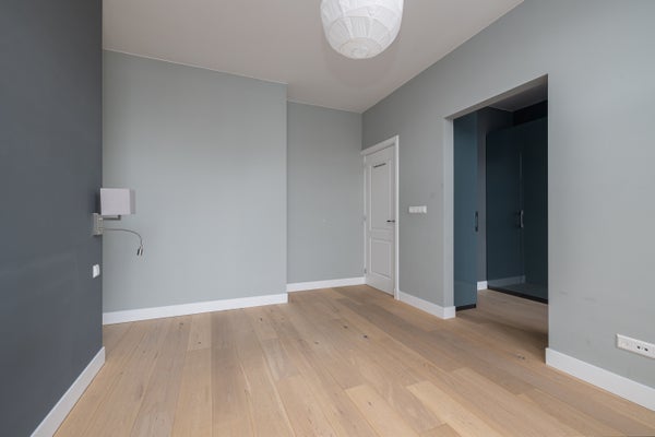 Landing with access to the rooms. Second separate toilet. Bedroom I, used as a master bedroom (approx. 25m2) and located at the rear of the house. This bedroom is the full width of the house and has a large walk-in closet. From this bedroom there is access to a spacious balcony (almost 9m2) located on the sunny south west. At the front is bedroom II of approx. 17m2, light and spacious with lovely views of the garden across the street. Good-sized separate laundry room with storage, counter space, sink and included washing machine and dryer. The luxurious bathroom has a double walk-in shower, washbasin and underfloor heating. Solid oak flooring throughout.