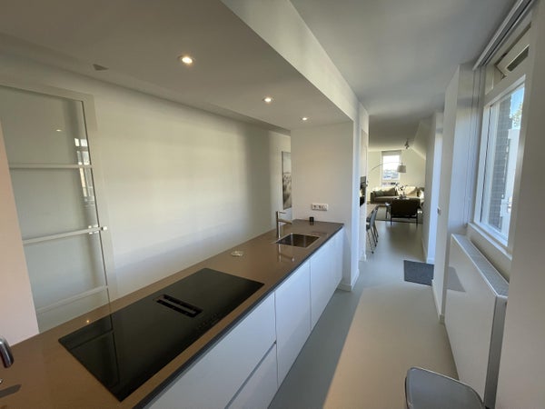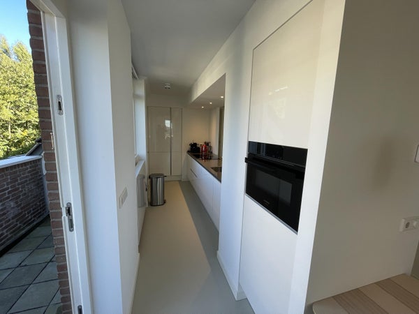 hal/gang, toilet, lichte woon/eetkamer (ongeveer 12.00/3.73) met gietvloer en toegang tot het balkon, nieuwe open keuken met inbouwapparatuur (o.a. koelkast, inductiekookplaat, combi-oven, afzuigkap, vaatwasser en koelkast/vriezer).
