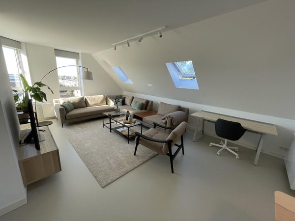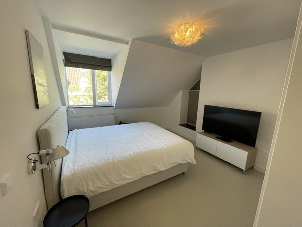 Charmant volledig gerenoveerd appartement op de 4e (bovenste) verdieping met: woonkamer, keuken, kantoor, 2 slaapkamers, 2 badkamers, toilet, parkeerplaats, kelderberging en lift in het gebouw.