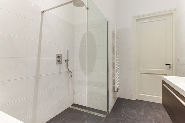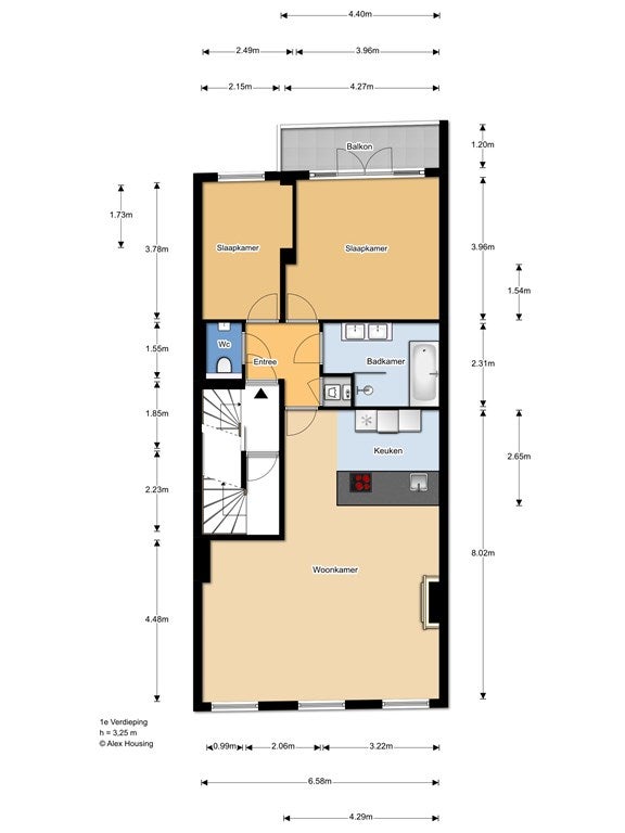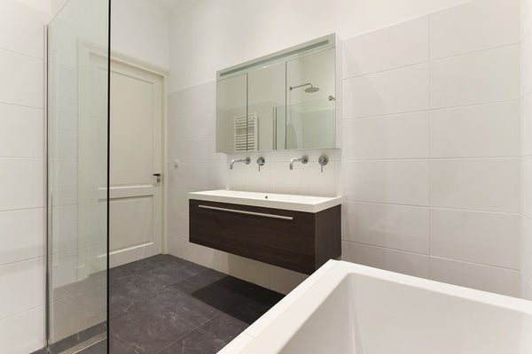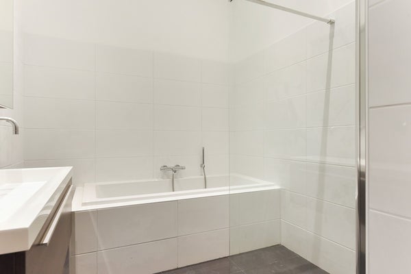 De trap in de gedeelde hal brengt je naar de eerste verdieping. Hier vind je de entree naar het appartement. De hal achter de voordeur biedt toegang tot alle vertrekken. De ruime woonkamer met open keuken bevindt zich aan de voorzijde van de woning. De badkamer met bad ligt in het midden, met aan de andere kant het aparte toilet. Aan de achterzijde vind je twee ruime slaapkamers. De grootste slaapkamer biedt toegang tot het balkon.
