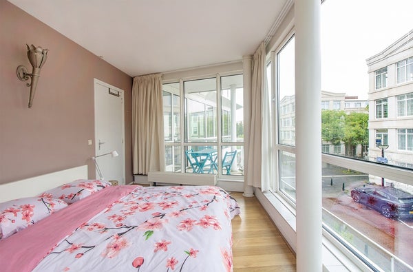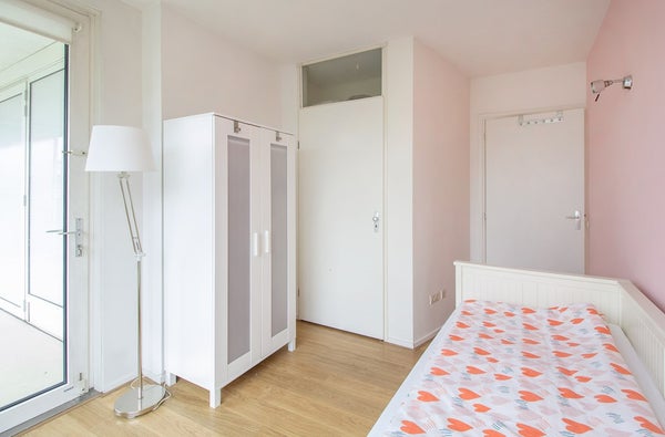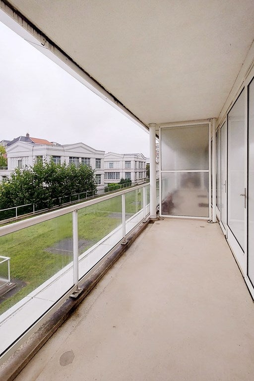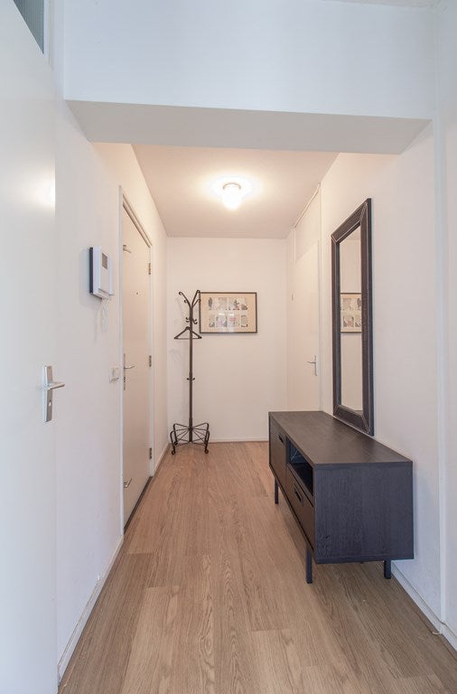 Bij binnenkomst in het appartement vindt u een ruime hal met kastruimte. De lichte en luchtige woonkamer en eetkamer beschikt over grote ramen en toegang tot een zonnig balkon op het zuiden. De open keuken is volledig uitgerust met inbouwapparatuur, waaronder een vaatwasser, oven, magnetron, elektrische kookplaat, afzuigkap en koelkast met vriesvak.