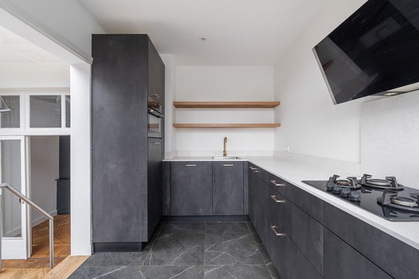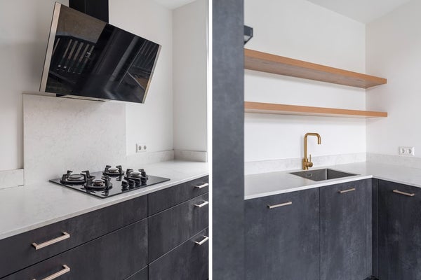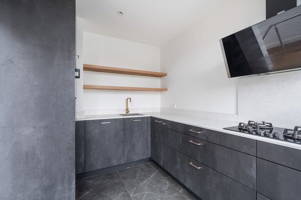 Wanneer je verder door het appartement loopt richting de achterkant, bereik je de lichte woonkamer en eetruimte. De keuken is goed uitgerust met verschillende inbouwapparaten en sluit naadloos aan op de rest van de leefruimte. Van hieruit kun je de ruime en zonnige dakterras betreden, een heerlijke plek om te ontspannen en van een drankje te genieten.
