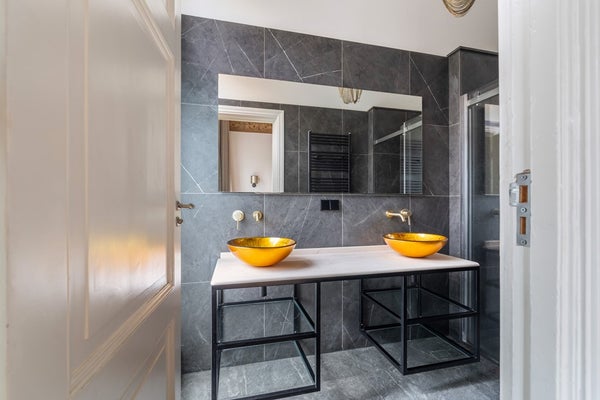 Aan de voorkant van het appartement vind je de en-suite slaapkamer. De aangrenzende badkamer is voorzien van een inloopdouche, een dubbele wastafel en een designradiator. Er is ook een aparte wc aanwezig.