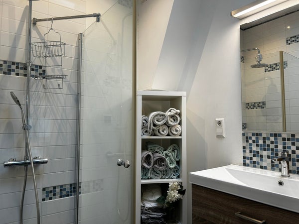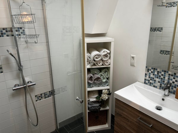 - Badkamer: Zeer nette, riante badkamer met bad, aparte douche en ruimte voor twee personen