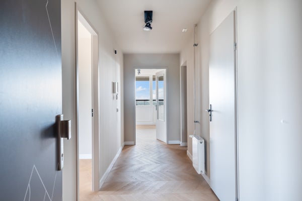 Entree van het appartement, de hal met links toegang tot de twee slaapkamers.