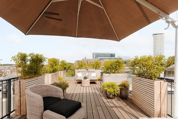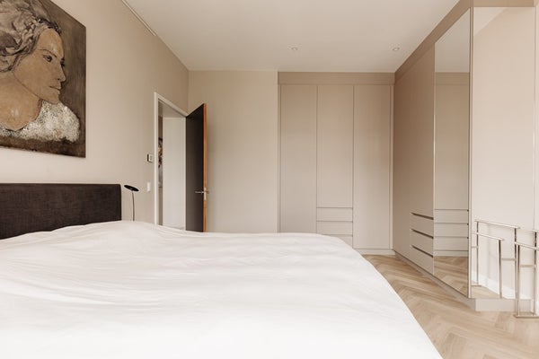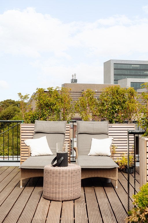 Twee royale slaapkamers met inbouwkasten bieden flexibiliteit voor een thuiskantoor, hobbyruimte of gastenverblijf. Luxueuze badkamer met moderne voorzieningen en een toilet. Vanuit de woonkamer toegang tot het fenomenale dakterras met voldoende ruimte voor comfortabele zitplaatsen.