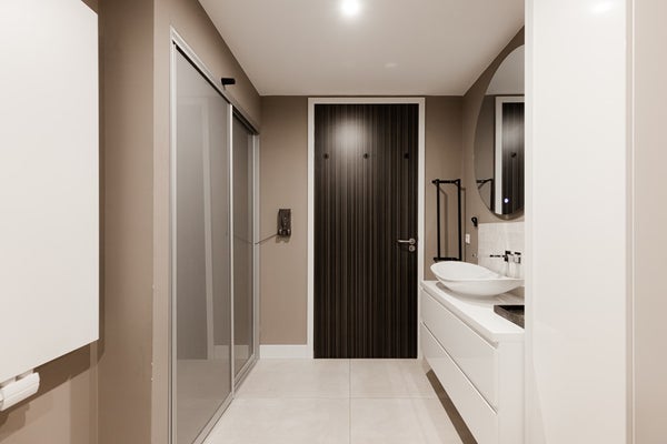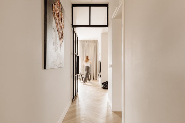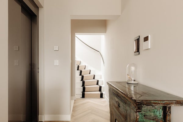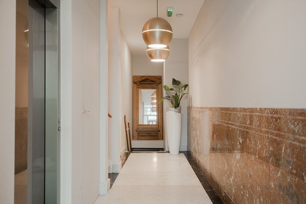 Gemeenschappelijke entree op de begane grond met trap of lift. Toegang tot het appartement via een privé overloop vanuit de interne lift. Hal met ruimte voor jassen en toegang tot een aparte gastentoilet.