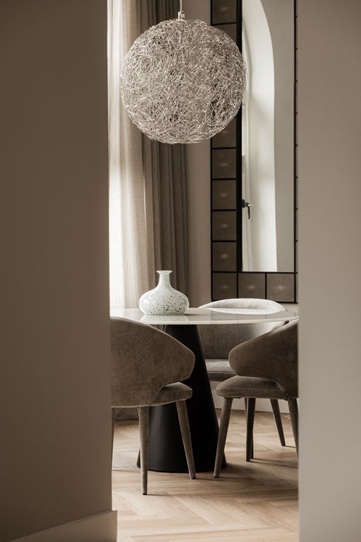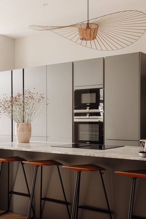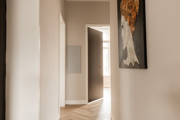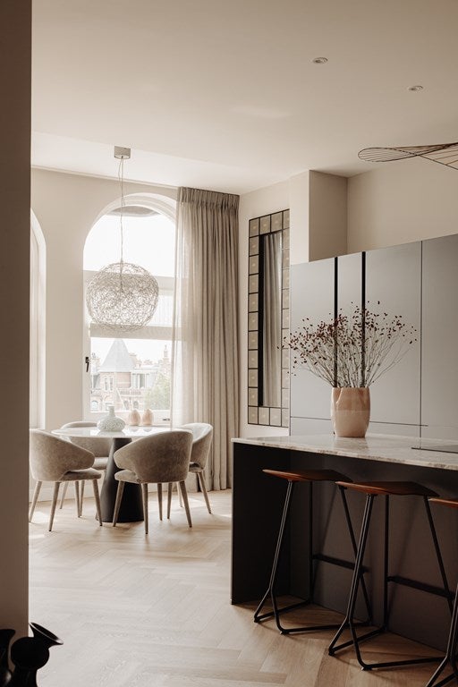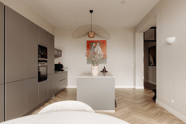 Heldere en ruime zitkamer met hoge plafonds (3,5 meter) en prachtige PVC-herringbone vloeren. De woonkamer is gecombineerd met een luxe keuken met een statige keuken-eiland, perfect om te koken of te genieten van een ochtendkoffie of avonddrankjes.
