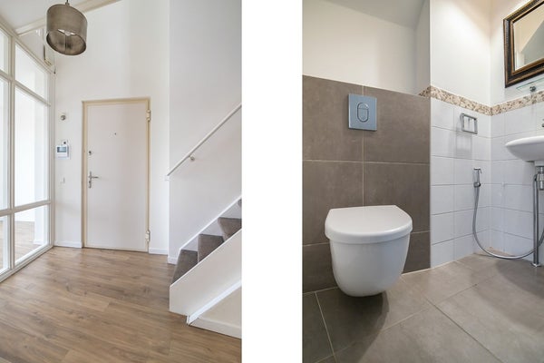 De gang leidt naar de ruime en lichte woonkamer die een mooi en breed uitzicht biedt. Open zijkamer, waar u perfect een thuiskantoor kunt creëren. Aan de achterkant is er een leuk overdekt balkon. Aparte eetkamer waarvandaan u de moderne keuken kunt betreden. De keuken is voorzien van alle gemakken die u nodig heeft, een kookplaat met afzuigkap, oven, magnetron, vaatwasser en een vrijstaande koelkast/vriezer zijn aanwezig. Aparte toiletruimte met fontein in de gang.