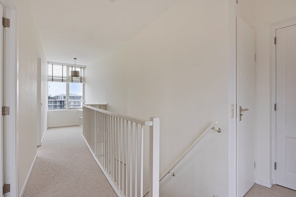 Trap naar de bovenverdieping waar zich alle slaapkamers bevinden, twee aan de voorzijde van de woning en de derde slaapkamer aan de achterzijde. Vanuit de master bedroom heeft u toegang tot het zonnige terras met uitzicht op de skyline van Den Haag. Een badkamer is voorzien van een douche en wastafel met spiegel, de tweede badkamer heeft een badkuip, aparte douche en wastafel. Berging met wasmachine en droger.