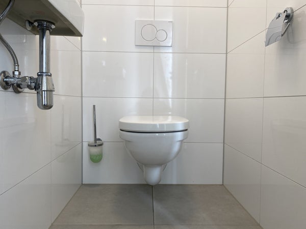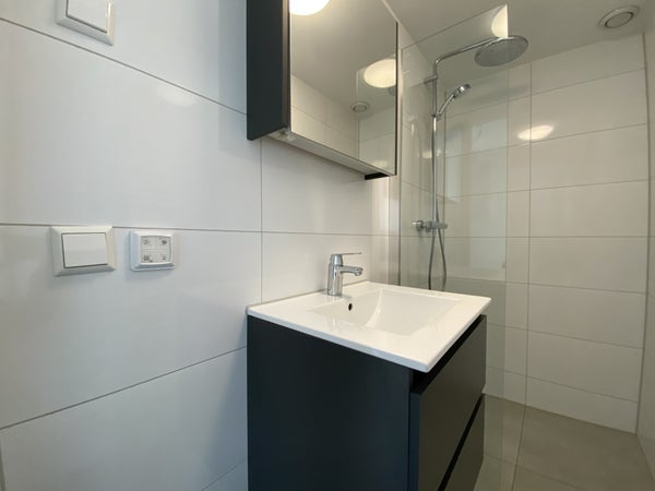 De moderne en volledig betegelde badkamer is voorzien van een inloopdouche met regendouche, wastafel met lades en handdoekradiator. Apart toilet met fontein.