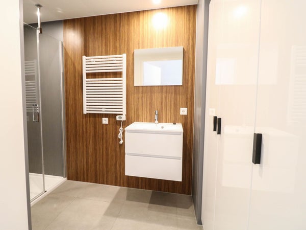 De ondergelegen etage bied via een lange gang toegang tot alle vertrekken: de (technische) ruimte met opstelplaats voor een wasmachine en droger en ingebouwde kasten, een apart zwevend toilet en de mooie nette badkamer met inbouwspotjes, een glazen douchewand, handdoekradiator, ruime inbouwkast en er is een mooi rechthoekig wastafelmeubel met lades en een grote spiegel. Als laatste treft u aan de achterzijde de ruime slaapkamer.
