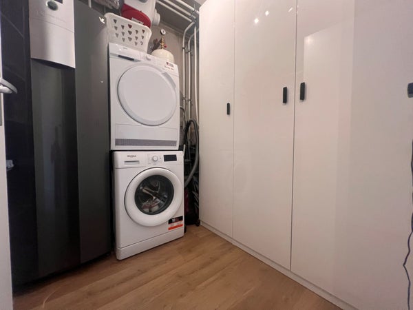 De moderne keuken is fraai en functioneel en is ingericht met diverse inbouwapparatuur van het betrouwbare merk Whirpool. Hier kunt u gebruik maken van een koelkast met vrieslade, een combi magnetron/oven, een electrische kookplaat en een roestvrijstalen afzuigkap. Voorts is er een plek om zelf een vaatwasser te installeren.