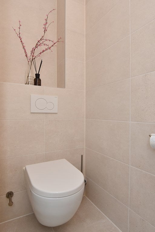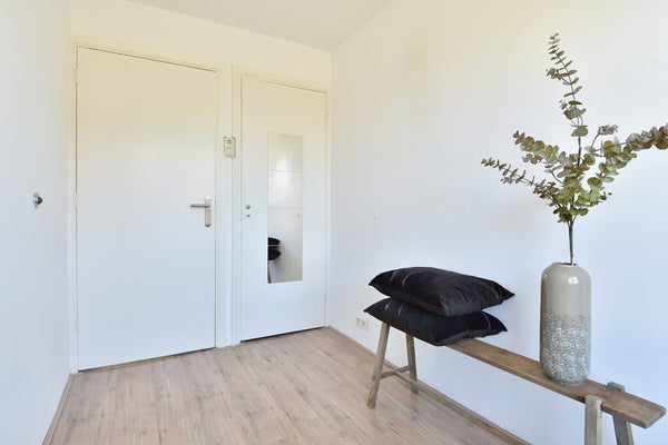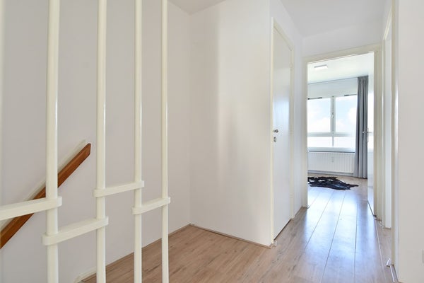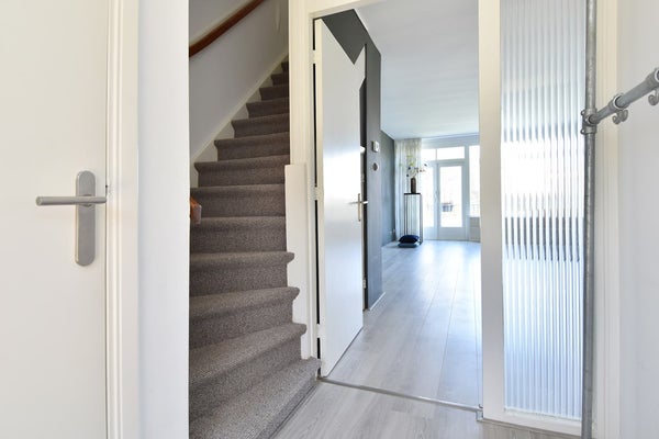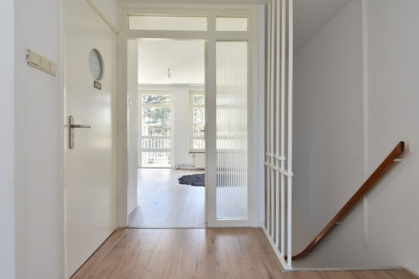 De algemene ingang bevindt zich op de begane grond. Trappen leiden naar de tweede verdieping, waar het appartement zich bevindt. Bij binnenkomst stap je de hal binnen met ruimte voor jassen, die toegang biedt tot het aparte toilet, de woonruimte en de trap naar de bovenverdieping.
